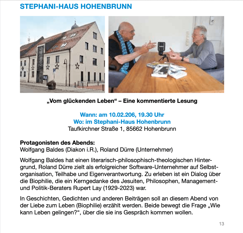 Das Lesebuch “Vom glückenden Leben – Lesebuch zur Biophilie”, herausgegeben von Wolfgang Baldes und Roland Dürre, (erweiterte Auflage, Oktober 2025, 220 S.) ist eine reichhaltige Sammlung von Texten verschiedenster Autorinnen und Autoren, die sich alle um das Thema Biophilie, also die Liebe zum Leben, drehen. Erstmals erschien es im Mai 2025 in der Dropbox von Wolfgang Baldes. Das Lesebuch befindet sich ab September 2025 auf der Rupert-Lay-Homepage zum direkten und freien Download.