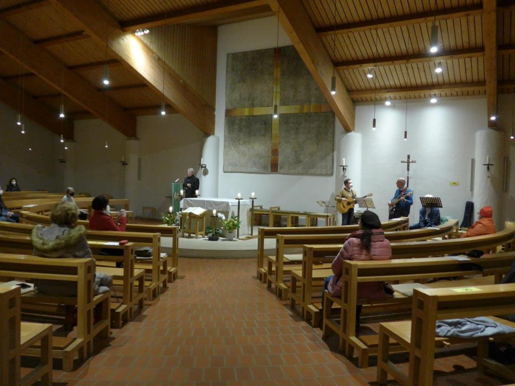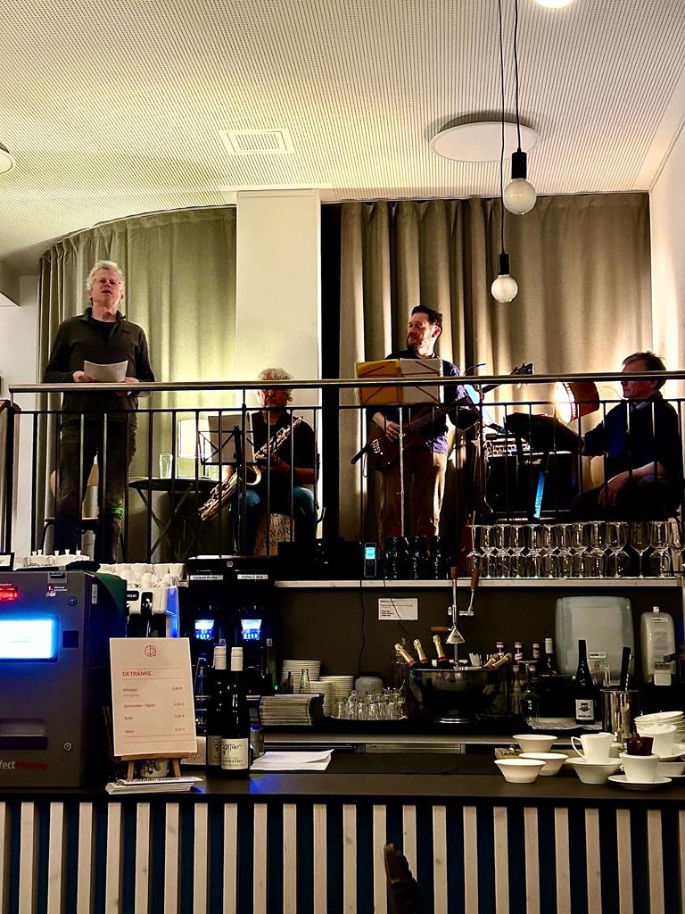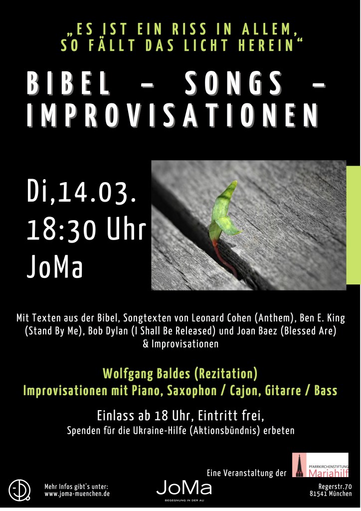 Zusammen mit Lektorin Ursula Schmüser (sie brachte die Bibeltexte gekonnt zur Geltung) trug er vor ca. 35 Teilnehmenden Songtexte im rhythmisch vorgetragenen Orginal und in eigener Übersetzung vor. Anschließend wurden die Songs mit Bass-Gitarre, Gitarre, Saxofon und Cajon – in oft perfektem Zusammenspiel – improvisiert. Leider war der Keyboarder kurzfristig erkrankt. Da die Musiker sich gut auf den Abend vorbereitet hatten, planen sie nun in voller Besetzung ihre Improvisationen noch einmal in einer Münchner Kirche zu Gehör zu bringen.