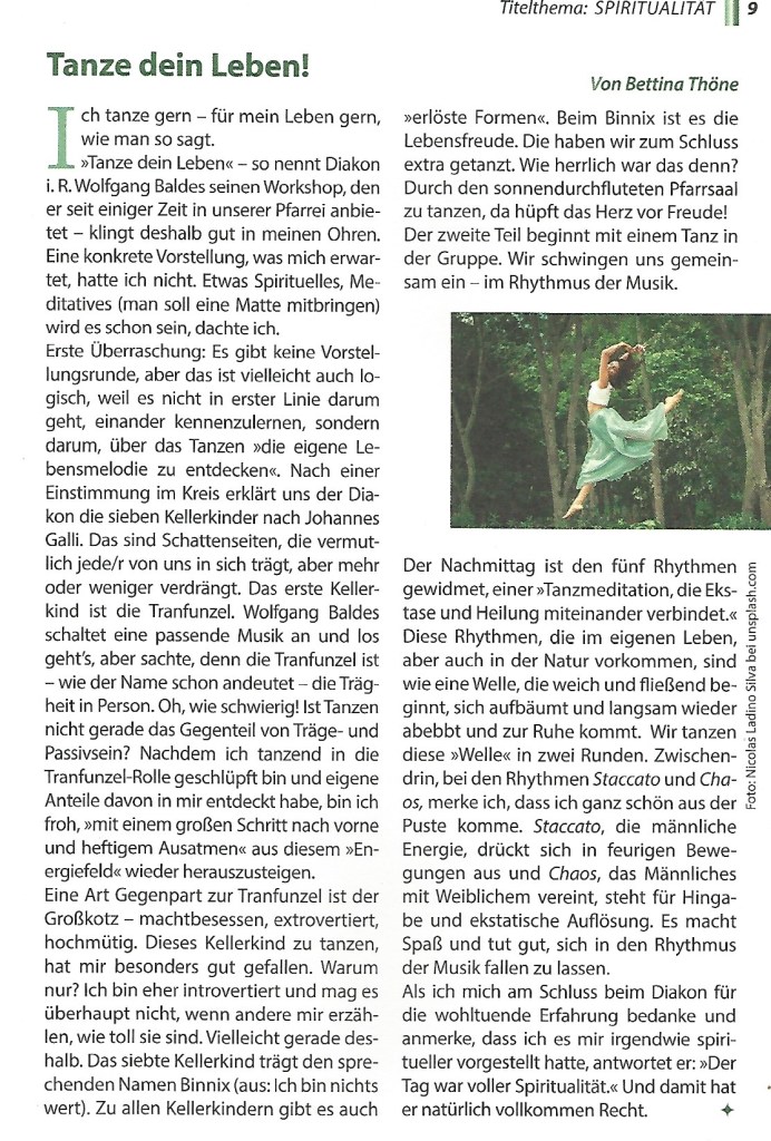 Nach dem Tod meiner ersten Frau bin ich 2014 in eine psychosomatische Klinik gegangen und habe dort vor allem über das freie Tanzen meine Lebenskraft wieder gefunden. Zwei Methoden im freien Ausdruckstanz wurden in der Klinik angeboten: